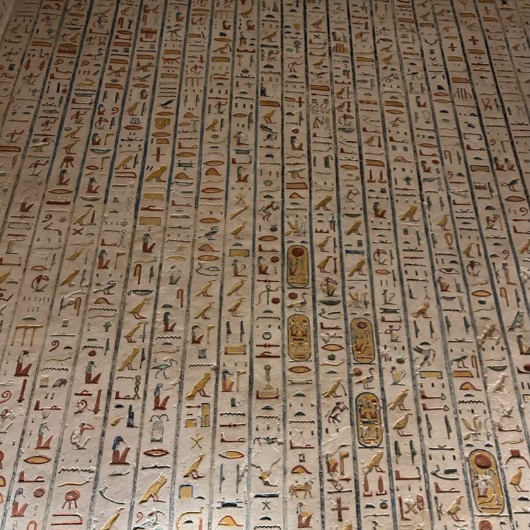At 5 am, we headed to Luxor airport for a quick flight to Cairo. Upon arrival, we drove to Saqqara to see the Step Pyramid of Djoser, the first pyramid ever built. Unlike the iconic pyramids of Giza, this pyramid is less famous because its shape isn’t the perfect triangle they aimed for, like this picture depicts. In the distance, we could see other pyramids with varying shapes, including another with one with a curved side.