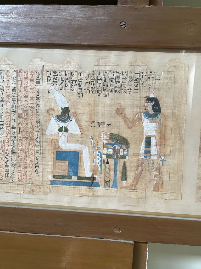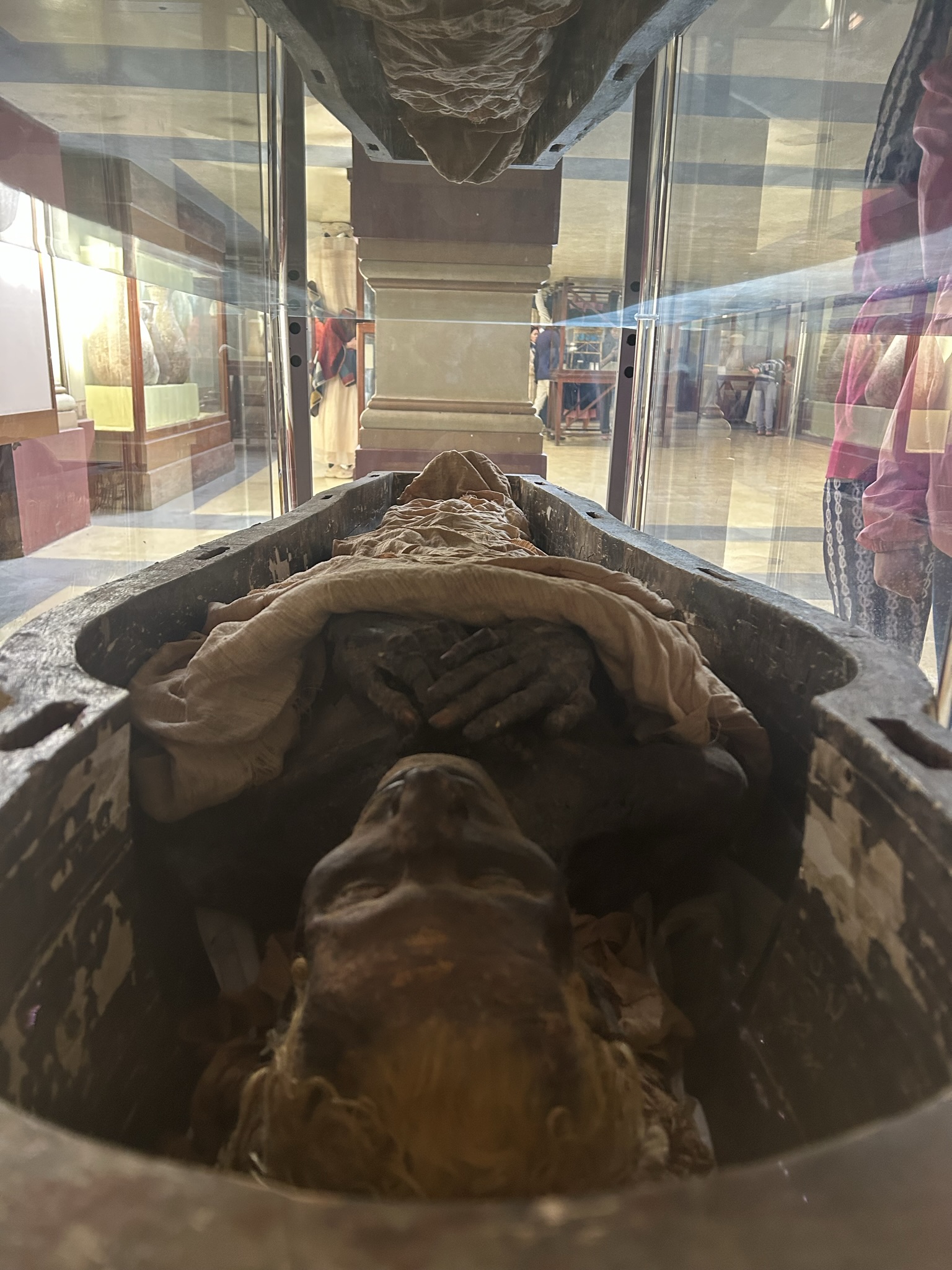 Our next destination, the Egyptian Museum in Cairo, was an incredible array of statues, coffins, beads, papyrus paintings, and artifacts from ancient, middle, and modern Egypt. There is a room that holds King Tutankhamun’s 22.5 lb. (10.23kg) gold funerary mask and all of his jewelry. We even saw mummies with completely intact hair! A bit eerie in my opinion. Personally, I loved viewing all the papyrus paintings of the gods and the accompanying hieroglyphs.