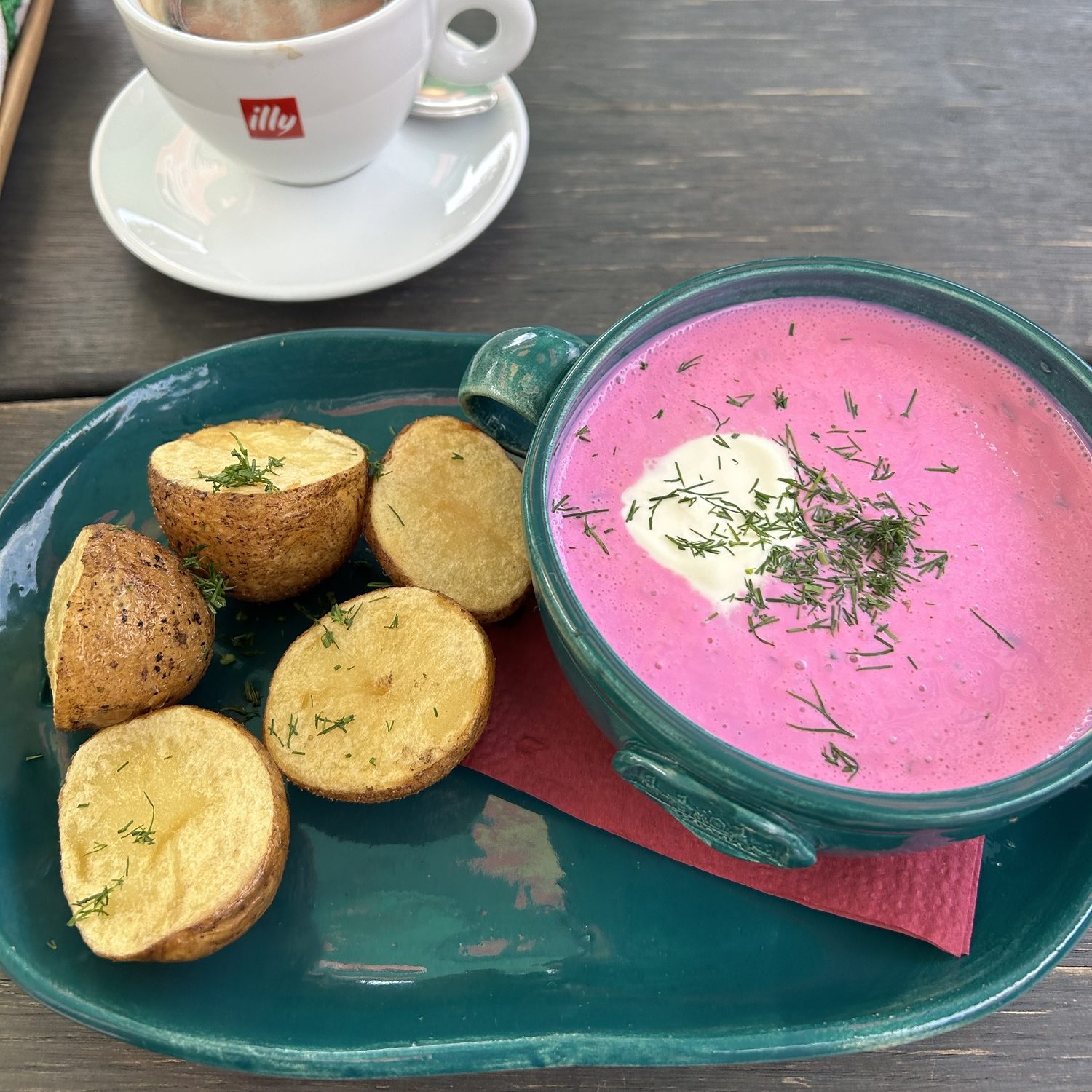 We started with cold beetroot soup (Šaltibarščiai), a vibrant pink dish made from fermented yogurt, cucumbers, dill, eggs, and beets. It’s served with hot boiled potatoes, which you mix into the soup. It was delicious, though slightly tangy.