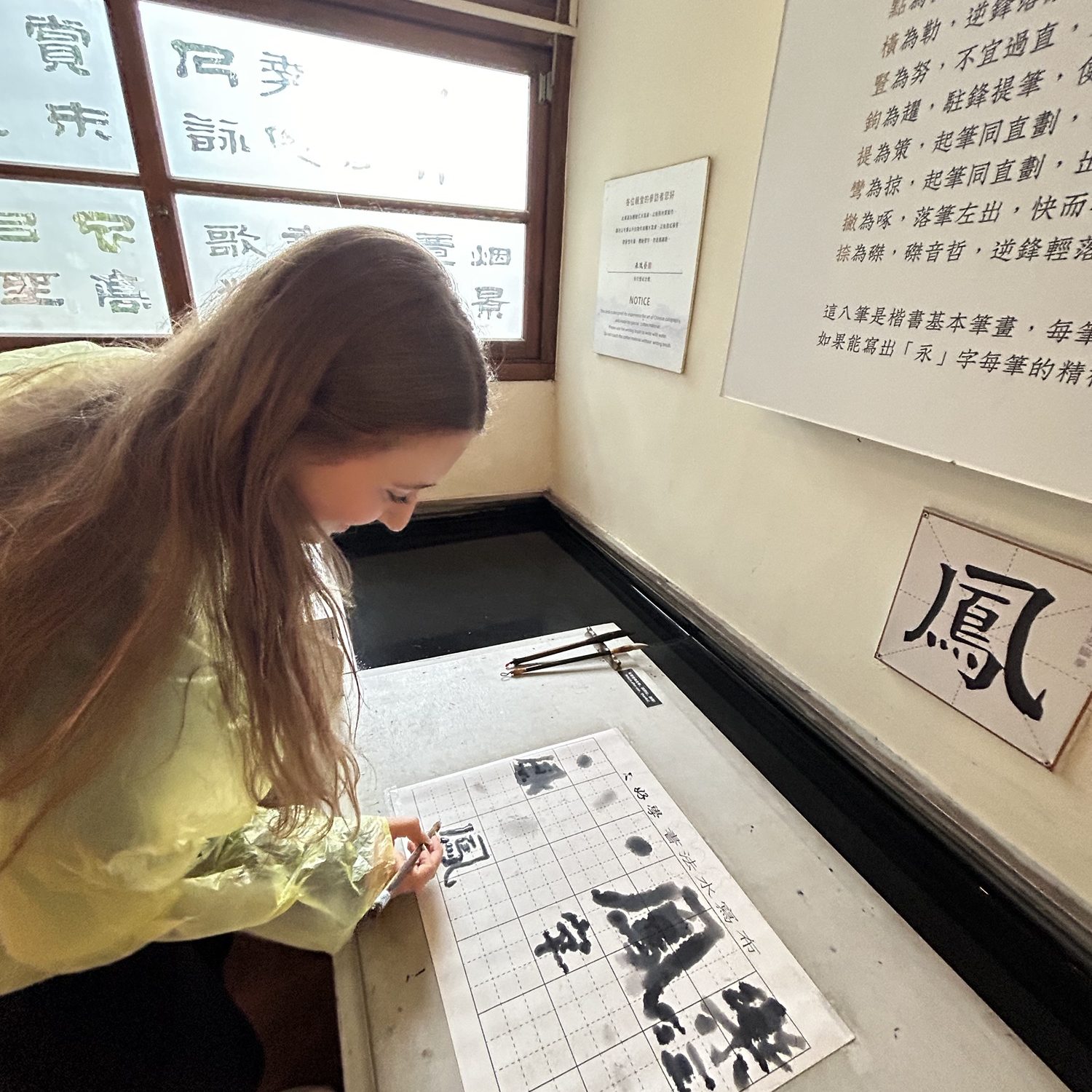 Right next to the tree house we went into the Pavilion of Shih Sao Jhou, famous for its calligraphy displays. Inside, we even got to try calligraphy ourselves, sort of. Instead of ink, we used special water-reactive paper, where the writing appears with water and then disappears as it dries, making it reusable.