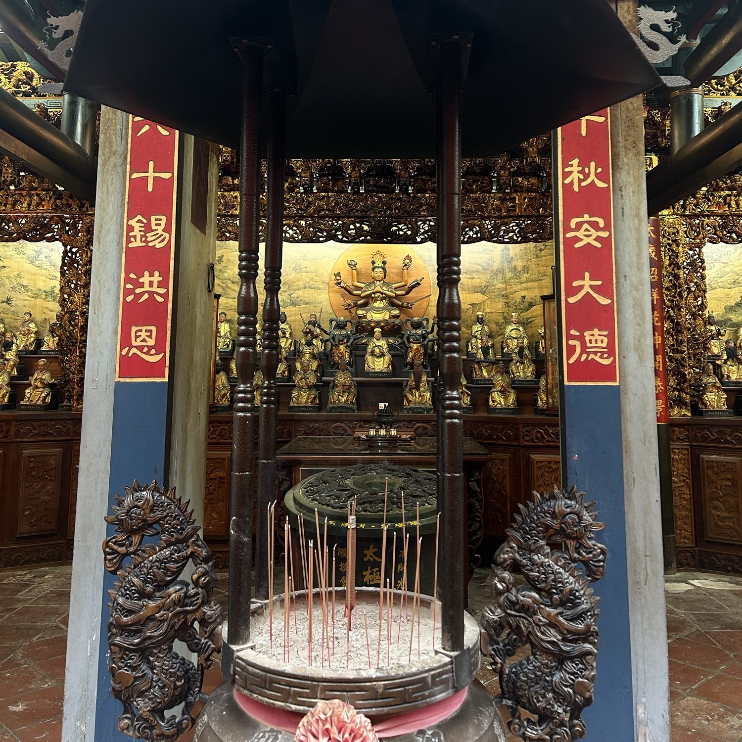 Across the street, my family and I wandered into a Taoist temple. It was a fascinating comparison of the differences in interior design. The temple was incredibly colorful, covered in intricate carvings, golden statues, and bright lanterns. People were actively praying with incense sticks, offering them to different gods as part of their rituals.
