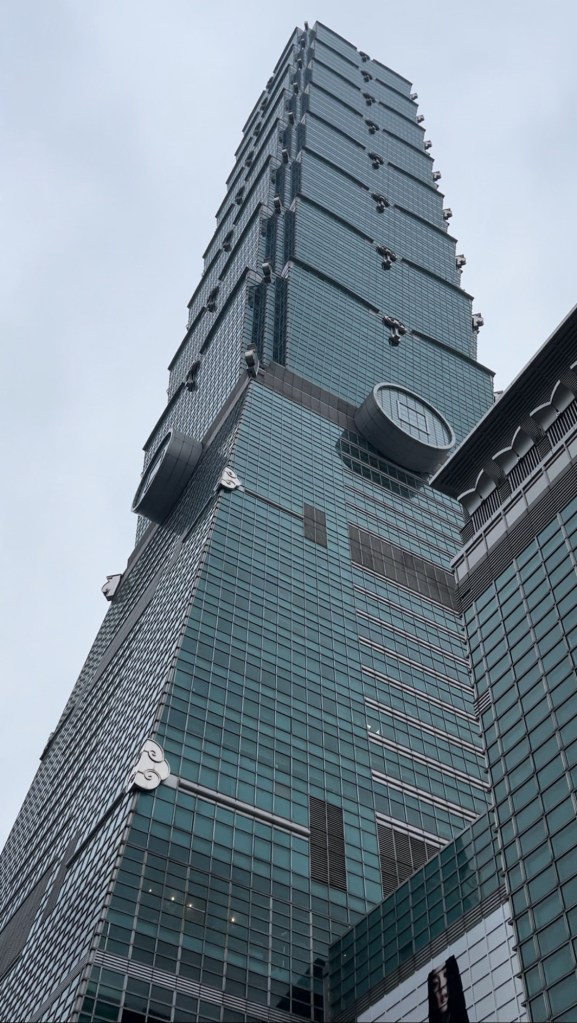 After reuniting, we started by making our way to the Taipei 101, which was for many years the tallest building in the world and is currently the 11th tallest. Designed to resemble bamboo, a symbol of resilience, the tower was completed in 2004. It features a massive tuned mass damper weighing 660 metric tons! This is a giant hanging ball that stabilizes the structure against strong winds and earthquakes. It was on display which was pretty neat to see, offering a fascinating display of inertia.