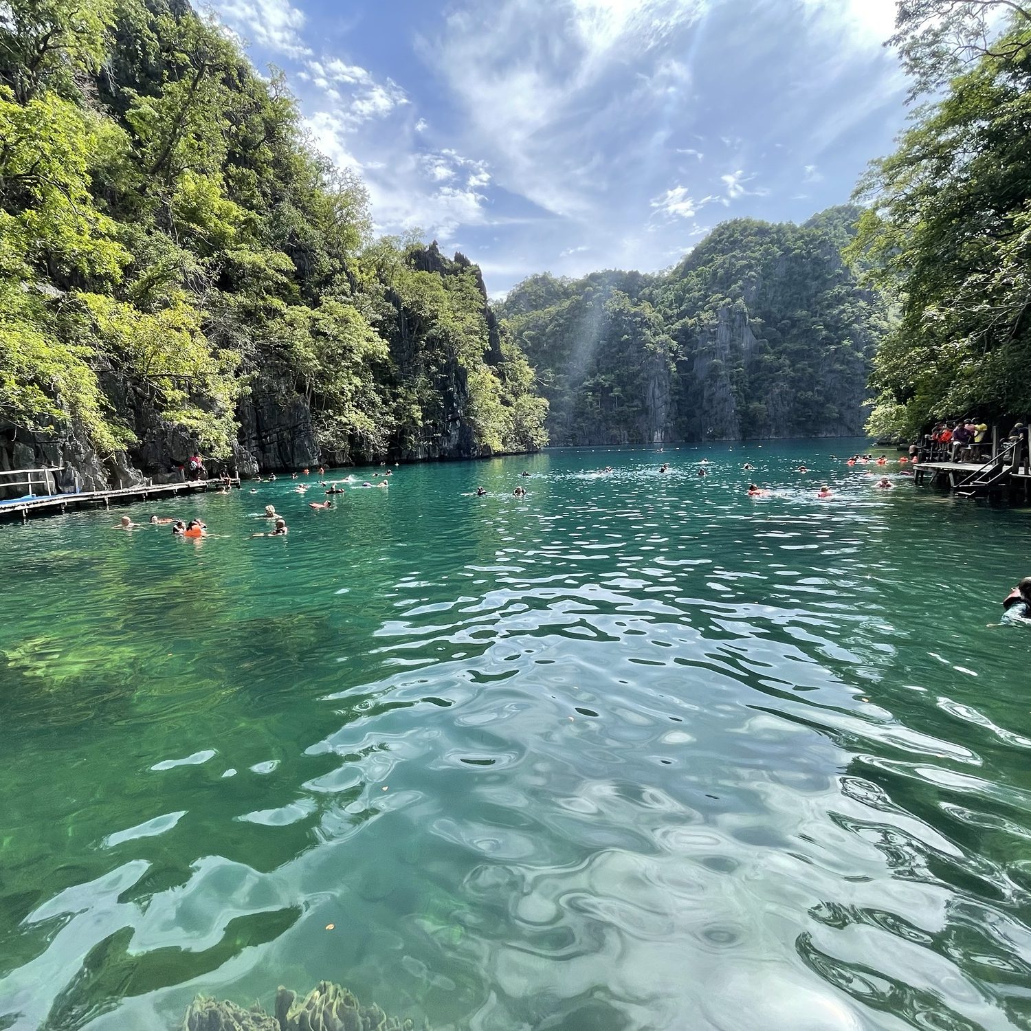 Arriving at our first stop felt like stepping into a postcard! The water in the cove was a mesmerizing shade of blue, this including the sky as well, and dramatic rocky mountainsides jutted out of the sea, covered in green foliage. It was the kind of place that looked too perfect to be real. This breathtaking island, Palawan, was had our first couple destinations and we started at Kayangan Lake.