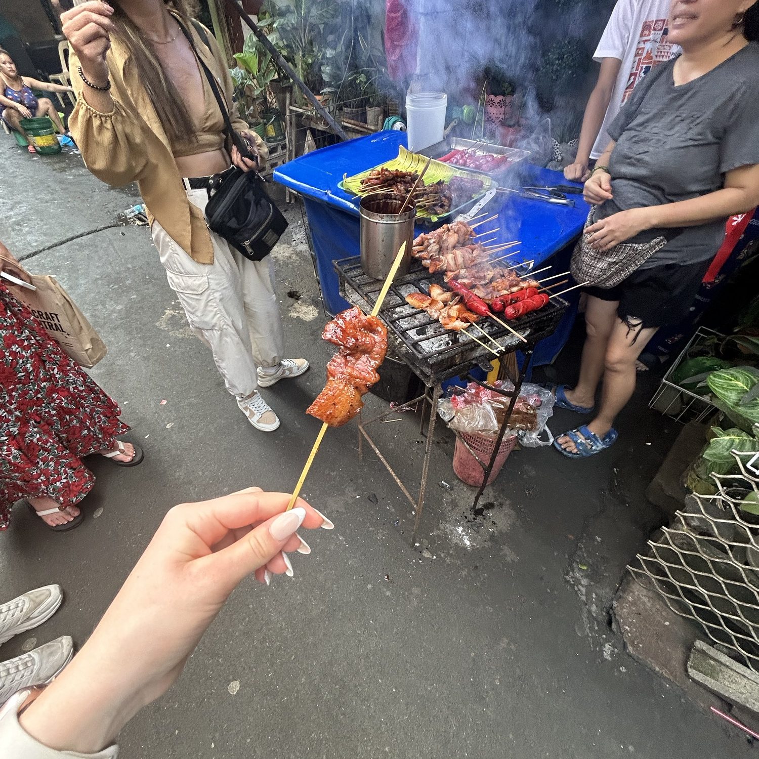 As we continued, we came across a small food stand outside one of the houses. They were grilling up pork skewers. The flavors were incredible, and it was so tasty. The woman selling them asked if we’d mind taking a few pictures with her, she was super excited when we agreed! Her son, taking the photo, was just shaking his head so amused at her antics!