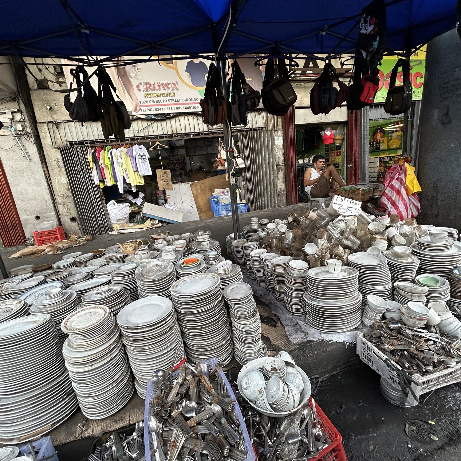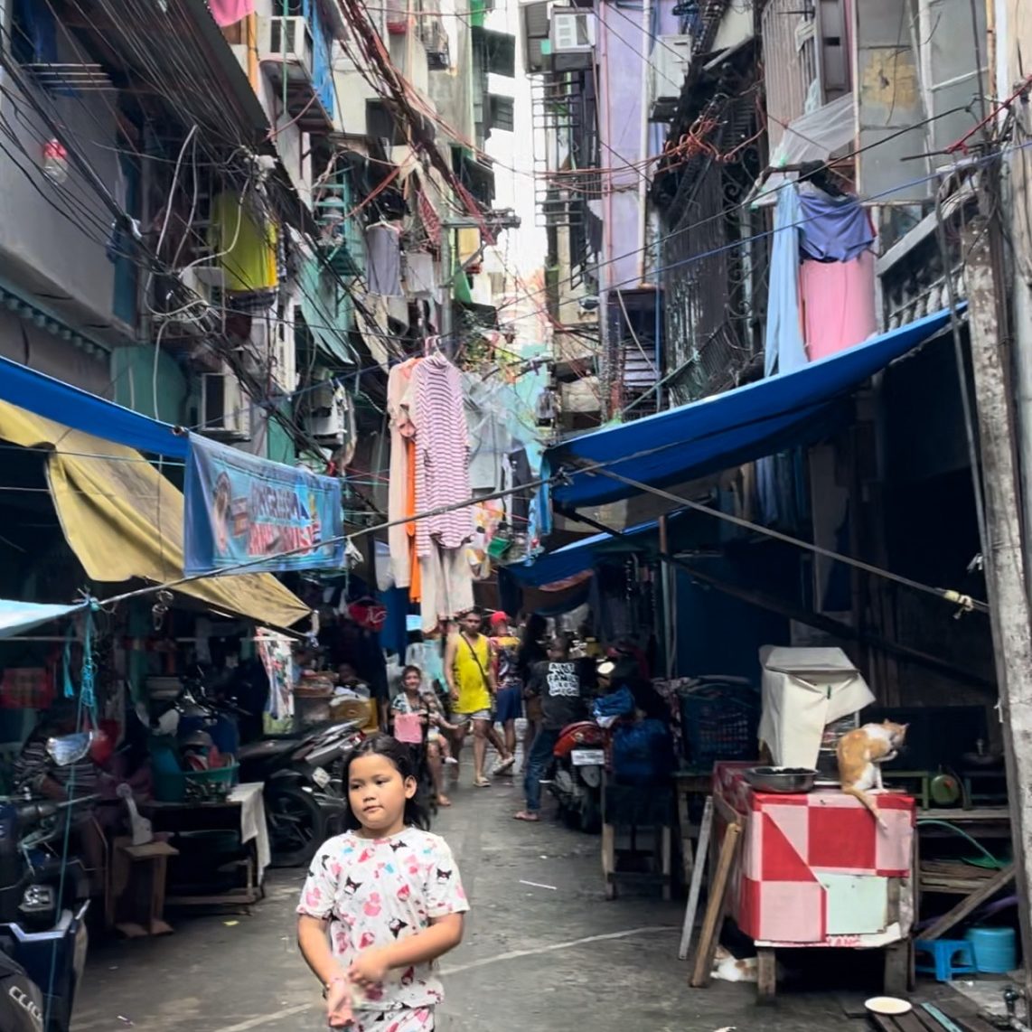 Wow, it took forever to get there! We had heard that the traffic in Manila was comparable to India, and we finally understood what that meant when we reached the other side of the city. This area was much more rundown but also far more lively, with street stands lining both sides of the road, and people weaving in and out of cars and scooters. It felt like we were the only actual car on this road, which made sense given how much traffic was at a standstill. Navigating through the chaos with a taxi wasn’t really possible—scooters, tuk-tuks, and walking was definitely the way to go.