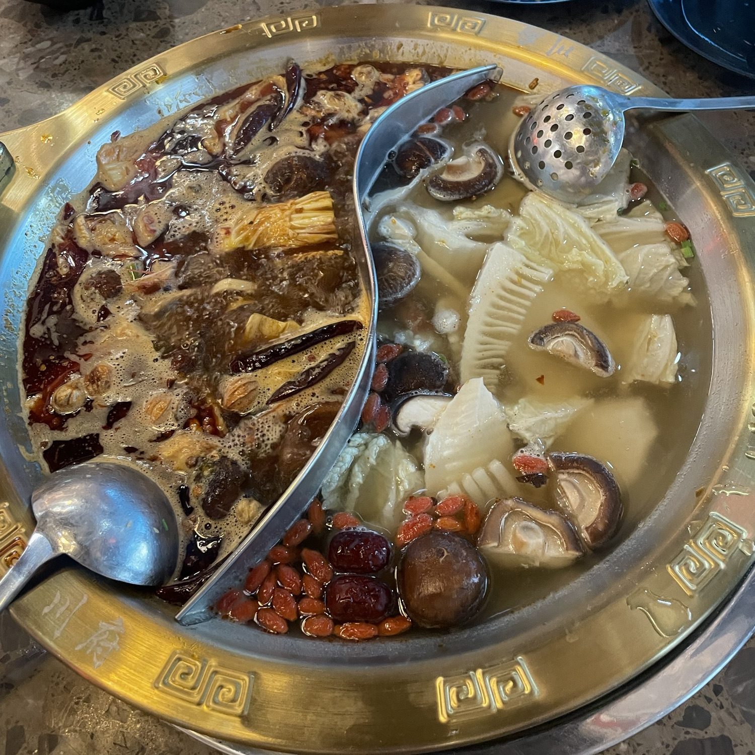 Stepping inside, we had no idea how it worked—and we were also the only customers, with about ten workers watching us. They did their best to explain, but the language barrier made things a bit tricky. Eventually, we figured it out and ordered a variety of ingredients. For our broths, we chose a mild chicken broth and a spicy one. We double-checked with the waitress, asking if the one-pepper symbol meant it would be too spicy. She assured us it wouldn’t be, but I’m not sure if we were fully understood.
