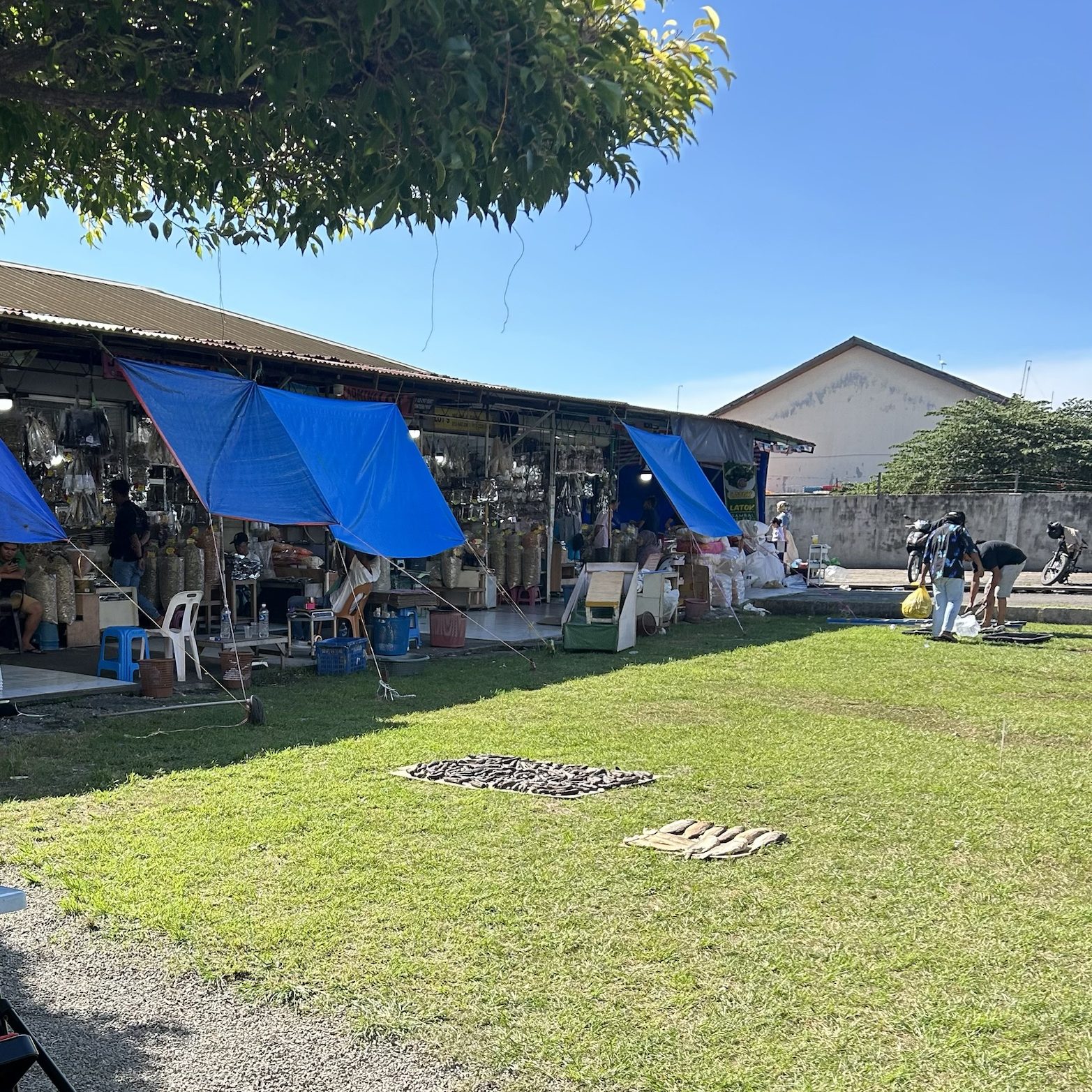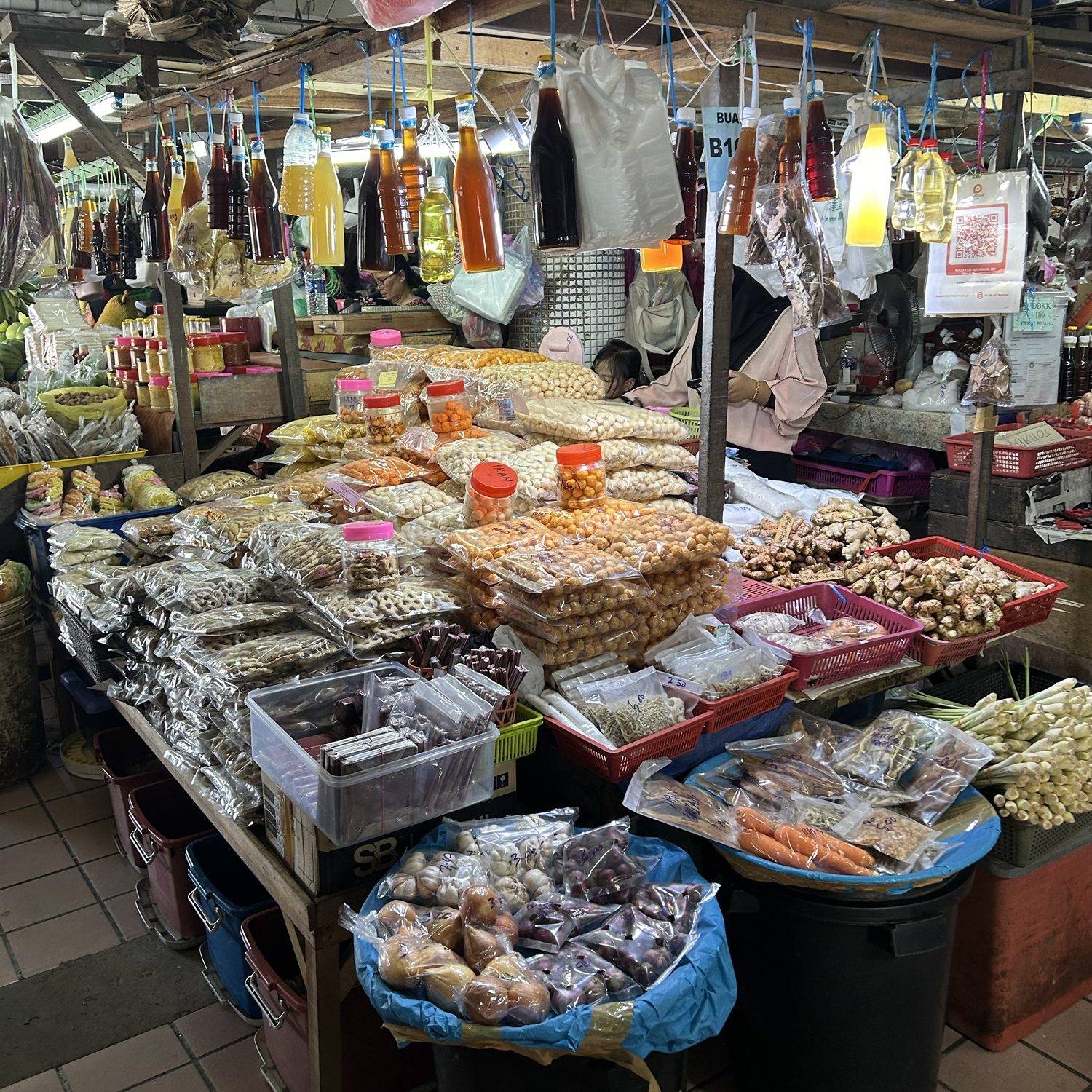 Wandering further, we found ourselves in a bustling food market. Towering stacks of durian—some larger than two of my heads—stood out with their unmistakable look alongside other exotic fruits. We grabbed some lychees to snack on as we weaved through stalls filled with fresh fish, dried seafood, and even seahorses!