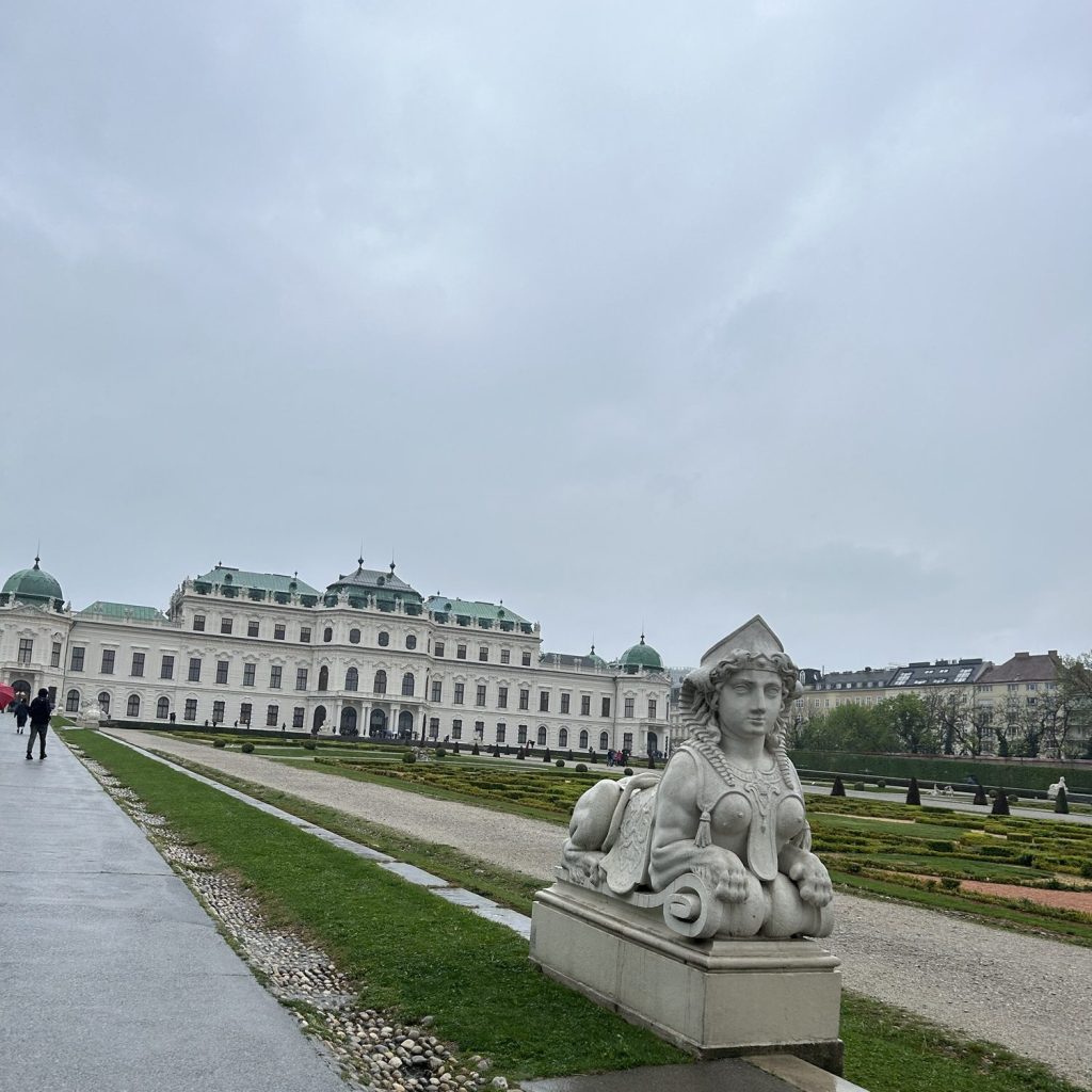 Next, we hopped on a tram to the Belvedere Palace. Unfortunately, that’s when it started to absolutely pour. Only two of us had umbrellas for the four of us, and the wind was relentless. The walk up to the palace was long and couldn’t have been more chaotic. Our umbrellas kept flipping inside out every couple of minutes.